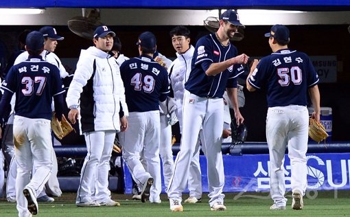 두산 외국인 에이스 더스틴 니퍼트(오른쪽 2번째)가 27일 대구구장에서 열린 삼성과의 한국시리즈 2차전에 선발등판해 7이닝 3안타 2볼넷 5탈삼진 무실점으로 팀의 승리를 이끌었다. 니퍼트가 7회 마지막 아웃카운트를 잡아낸 뒤 덕아웃으로 돌아오면서 좌익수 김현수와 주먹을 맞부딪치고 있다.대구|김민성 기자 marineboy@donga.com