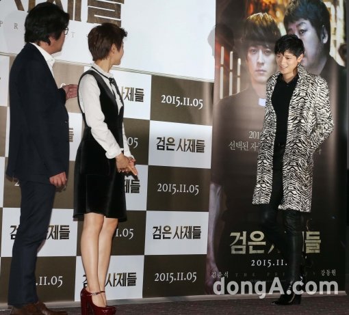 배우 강동원(오른쪽)이 28일 오후 서울 왕십리 한 멀티플렉스에서 열린 영화 검은 사제들 언론시사회에 참석하고 있다. '검은 사제들'은 11월 5일 개봉 예정.