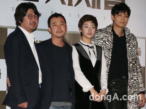배우 김윤석, 감독 장재현, 박소담, 강동원이 28일 오후 서울 왕십리 한 멀티플렉스에서 열린 영화 검은 사제들 언론시사회에 참석해 포토타임을 하고 있다. '검은 사제들'은 11월 5일 개봉 예정.