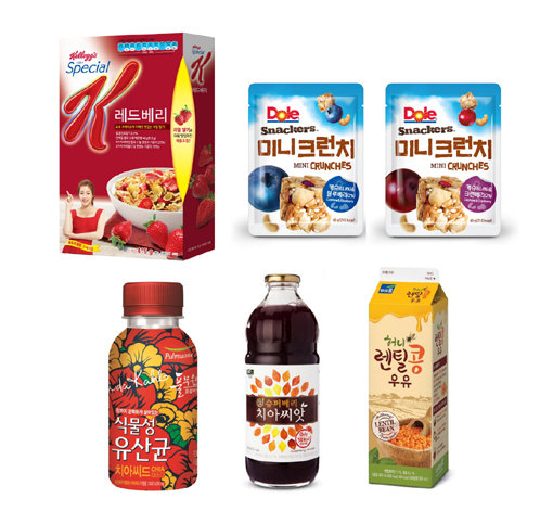 곡물과 견과류에는 각종 영양소가 풍부하고 항산화 성분이 함유되어 있어 다이어트와 피부 미용에도 도움이 된다. 켈로그, 돌(2개), 풀무원, 자연원, 푸르밀 제품.