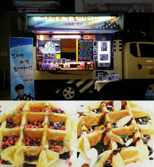공개된 사진에는 ‘정스타가 쏩니다! 퍼펙트 센스 화이팅. 정경호 드림’이라고 적힌 현수막이 붙은 간식차의 모습이 담겨있다.