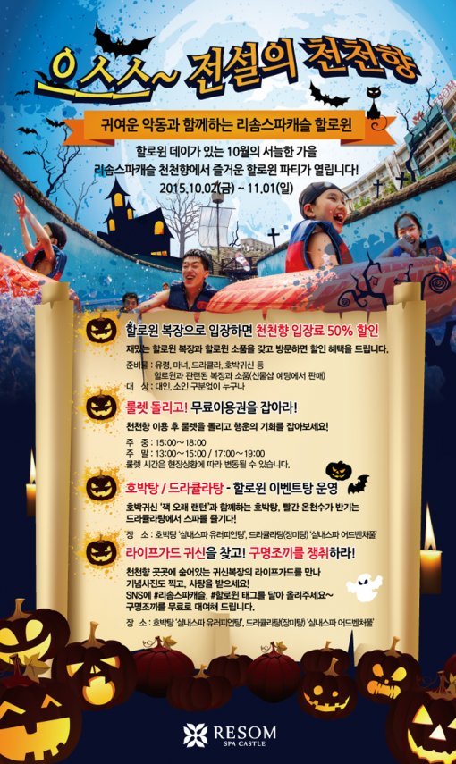 유령, 마녀, 드라큘라 등 할로윈 복장을 하고 온 입장객에게 천천향 입장권을 50% 할인한다.
