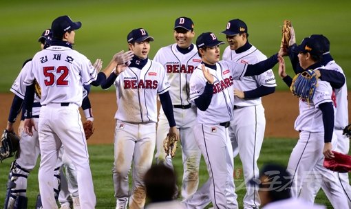 29일 서울 잠실야구장에서 ‘2015 타이어뱅크 KBO 리그’ 한국시리즈 3차전 삼성라이온스와 두산베어스 경기가 열렸다. 5-1 역전승을 거두며 시리즈 전적 2승 1패를 기록한 두산 선수들이 하이파이브 하고 있다. 잠실|김종원기자 won@donga.com