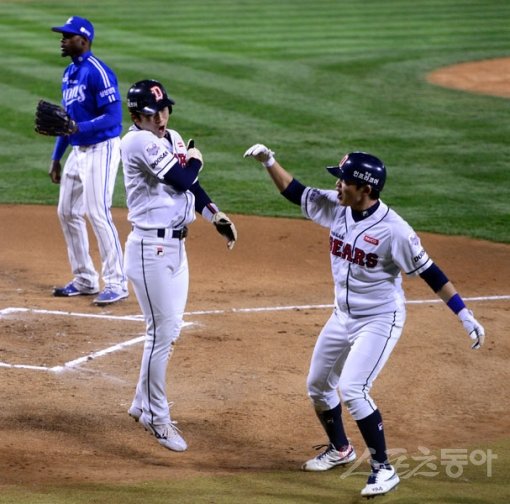 30일 서울 잠실야구장에서 `2015 타이어뱅크 KBO 리그` 한국시리즈 4차전 두산 베어스와 삼성 라이온즈의 경기가 열렸다. 1회말 2사 1,3루에서 두산 김현수의 1루수 앞 땅볼 때 삼성 1루수 구자욱의 송구 실책으로 홈에 들어온 허경민(가운데)이 정수빈과 하이파이브를 하고 있다.