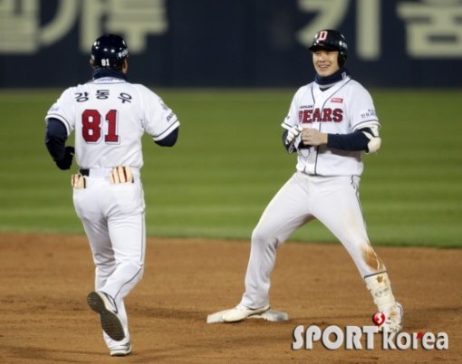30일 오후 서울 잠실구장에서 열린 2015 타이어뱅크 KBO리그 포스트시즌 한국시리즈 4차전 두산 베어스와 삼성 라이온즈의 경기 두산 5회말 2사 1,2루에서 3번 민병헌이 2루주자를 불러들이는 좌전 2루타를 치고 2루에서 미소를 짓고 있다.