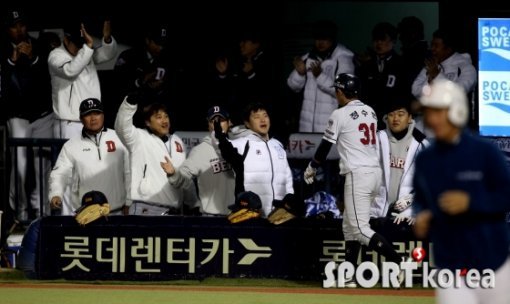 30일 오후 서울 잠실야구장에서 열린 `2015 타이어뱅크 KBO 리그` 두산 베어스 대 삼성 라이온즈 한국시리즈 4차전 5회말 2사 1,2루에서 두산 민병헌의 역전 1타점 2루타로 홈을 밟은 2루주자 정수빈이 덕아웃 동료들의 환영을 받고 있다.