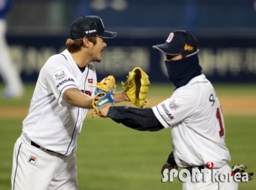 30일 오후 서울 잠실구장에서 열린 2015 타이어뱅크 KBO리그 포스트시즌 한국시리즈 4차전 두산 베어스와 삼성 라이온즈의 경기에서 두산 노경은이 삼성 6회초 1사 1,2루에서 5번 박석민을 내야땅볼 유도 병살처리 시긴 뒤 이닝을 마치고 오재원을 격려하고 있다.