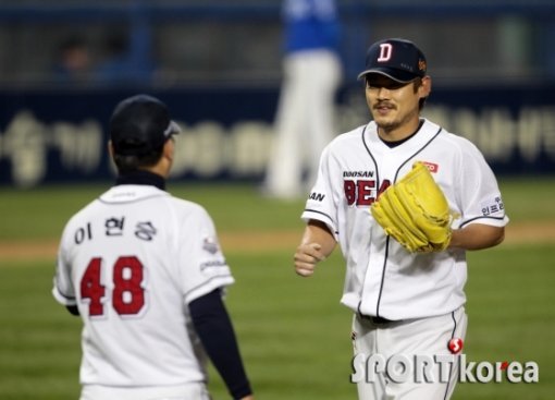 30일 오후 서울 잠실구장에서 열린 2015 타이어뱅크 KBO리그 포스트시즌 한국시리즈 4차전 두산 베어스와 삼성 라이온즈의 경기에서 두산 노경은이 8회초 1사 1루 삼성 나바로 타석 때 마운드에서 물러나며 이현승과 교체되고 있다.