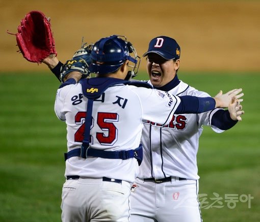 30일 서울 잠실야구장에서 열린 `2015 타이어뱅크 KBO 리그` 한국시리즈 4차전 두산 베어스와 삼성 라이온즈의 경기에서 민병헌의 역전 적시타와 노경은, 이현승의 역투로 두산이 4-3 승리를 거뒀다. 경기 후 두산 이현승과 양의지가 환호하고 있다.