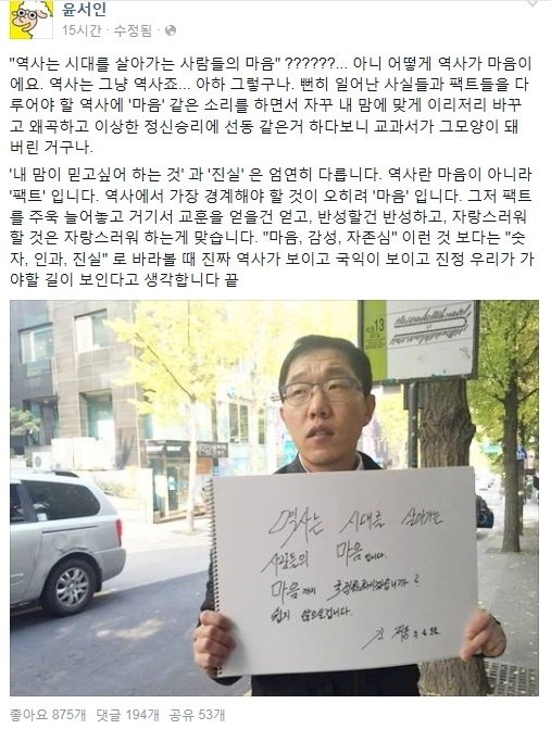 이어 “아하 그렇구나. 뻔히 일어난 사실들과 팩트들을 다루어야 할 역사에 ‘마음’ 같은 소리를 하면서 자꾸 내 맘에 맞게 이리저리 바꾸고 왜곡하고 이상한 정신승리에 선동 같은거 하다보니 교과서가 그모양이 돼 버린 거구나”라며 “‘내 맘이 믿고 싶어 하는 것’과 ‘진실’은 엄연히 다릅니다. 역사란 마음이 아니라 ‘팩트’ 입니다. 역사에서 가장 경계해야 할 것이 오히려 ‘마음’ 입니다”라고 말했다.