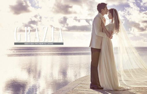 한그루 커플은 격주간 패션지 '그라치아'와 웨딩 화보를 촬영했다. 웨딩드레스와 턱시도를 입은 두 사람은 진짜 커플 답게 다정한 순간을 자연스럽게 연출했다. 평소 카메라에 익숙한 한그루는 물론 예비 신랑 또한 연예인 못지 않은 우월한 외모과 포즈로 시선을 사로잡았다.