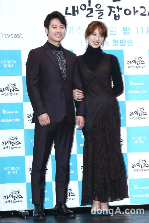 배우 김동욱(왼쪽), 이청아가 4일 오전 서울시 종로구 씨네큐브 광화문에서 열린 케이블채널 E채널 드라마 '라이더스: 내일을 잡아라' 제작발표회에 참석해 포토타임을 하고 있다.