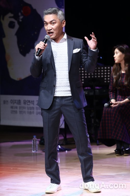 배우 조재윤이 4일 오후 서울 강남구 일지아트홀에서 열린 뮤지컬 '벽을 뚫는 남자' 제작발표회에 참석해 노래 시연을 하고 있다.