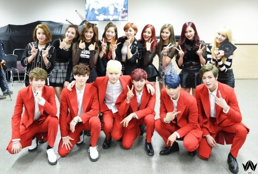 공개된 사진에는 ‘인기가요’ 대기실에서 붉은색 수트를 입은 VAV와 화려한 무대의상을 입은 트와이스의 모습이 담겼다. 특히 두 그룹은 각각 브이(V) 포즈를 취한 채 밝은 미소로 카메라를 바라보고 있다.