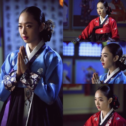 와는 전혀 다른 모습으로 시선을 사로잡는다. 눈매를 또렷이 한 눈 화장과 새빨간 입술색이 무녀 매월의 카리스마를 고스란히 전달한다.