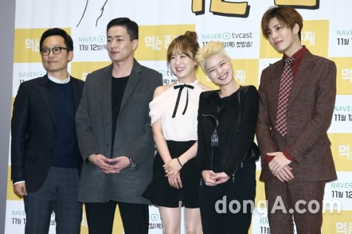 이철하 감독(왼쪽부터), 이병헌 감독, 배우 유소영, 안영미, 노민우우가 10일 오후 서울시 영등포구 여의도CGV에서 열린 웹드라마 ‘먹는 존재’ 제작발표회에 참석해 포토타임을 하고 있다.