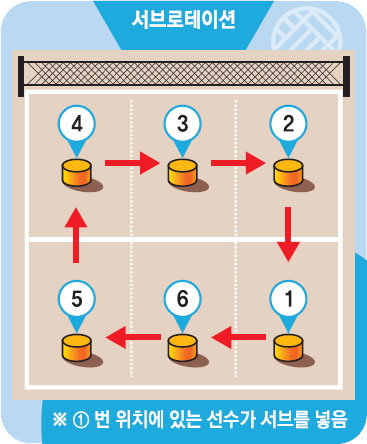 두 번째, 주심이 휘슬을 불기 전에 6명이었는데 선수가 갑자기 나가거나 들어왔을 경우다. 서브가 들어간 뒤라면 해당팀에는 ‘로테이션 폴트’가 선언되고 상대팀에 1점을 준다.