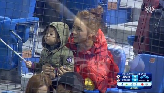 이용규의 아내 유하나는 이날 아들과 함께 경기장을 찾아 이용규를 응원을 했다.특히 이 모습이 야구 중계 화면에 잡혀 화제가 되고 있다.