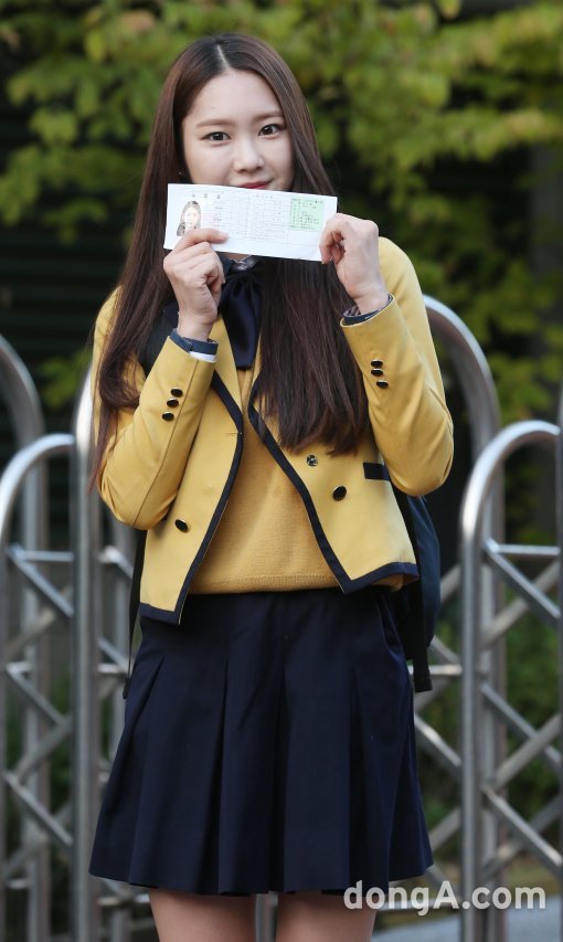 걸그룹 오마이걸의 지호가 12일 오전 서울 영등포구 영등포여고 앞에서 2016 대학수학능력시험을 보기 전에 밝은 표정을 짓고 있다.