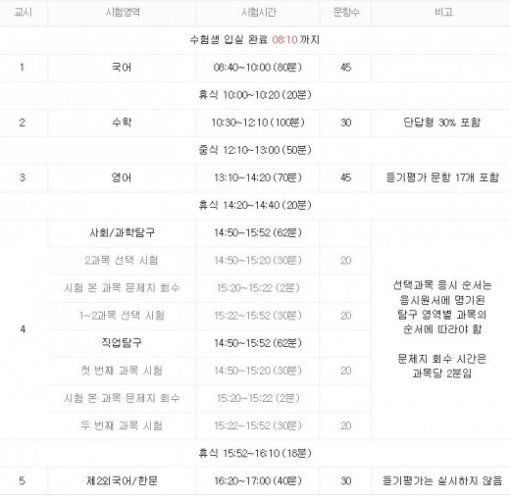 수능시간표 상 영어 듣기 평가가 진행되는 동안에는 모든 공항에서의 이륙 밑 착륙이 금지되고 비행중인 항공기는 지상으로부터 3km이상 상공에서 관제기간의 통제 하에 비행하도록 지시받는다.