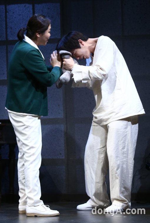배우 고수희(왼쪽), 이재균이 18일 오후 서울시 종로구 수현재씨어터에서 열린 연극 '엘리펀트 송'미디어콜에서 공연을 하고 있다.