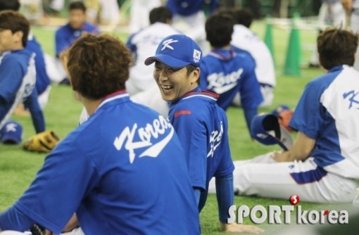 19일 오후 일본 도쿄돔구장에서 열리는 2015 WBSC 프리미어12 한국대표팀 대 일본대표팀의 준결승전에 앞서 한국 정우람이 스트레칭을 하며 환한 미소를 짓고 있다.
