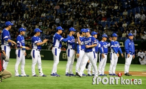 19일 오후 일본 도쿄돔구장에서 열린 2015 WBSC 프리미어12 한국대표팀 대 일본대표팀의 준결승전에 앞서 한국 선수들이 도열하고 있다.