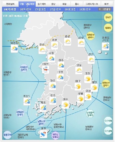 기상청은 26일 기압골의 영향을 받다 중국 북부지방에서 확장하는 차디찬 대륙고기압의 영향을 점차 받을 것으로 내다보며 경기남부와 강원북부, 충청남북도에는 눈(강수확률 60~80%)이 오겠고, 전라남북도와 제주도(산간 눈)에는 비 또는 눈(강수확률 60~90%)이 올 것으로 예보했다.