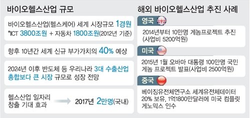 게놈을 활용한 맞춤의학에 대한 요구가 세계적으로 많아지면서 미국과 영국, 중국 등에서는 대형 게놈 프로젝트를 진행 중이다. 세계 헬스케어 시장은 2012년 기준 1경원으로 ICT(정보통신기술·3800조원)와 자동차(1800조원)를 합친 것보다 크다.