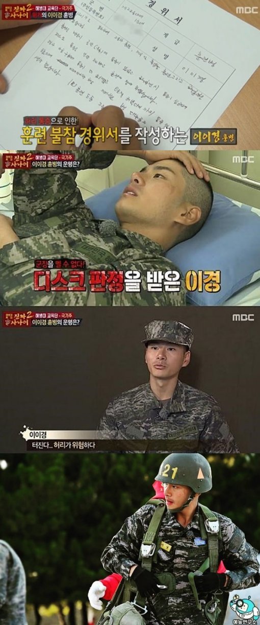 29일 ‘진짜 사나이’ 해병대 특집에서는 이이경이 중도 퇴소하는 모습이 방송됐다. 이이경은 허리디스크 판정을 받고 훈련에 불참했다. 이에 훈련 불참에 따른 경위서를 작성했다.