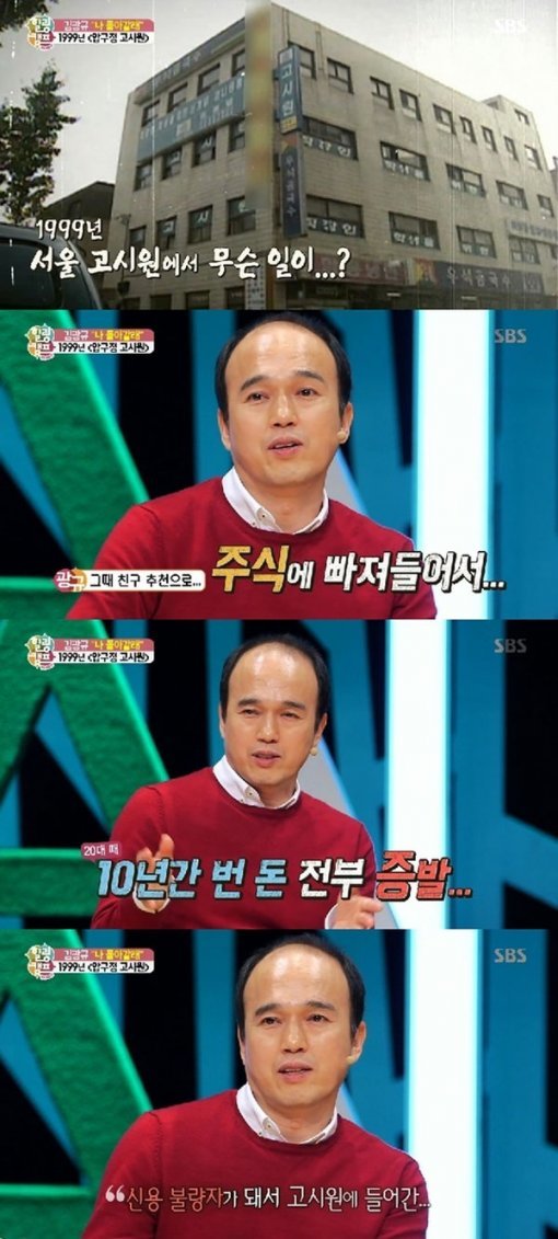 이날 김광규는 “33살에 친구 추천으로 주식에 빠져들어서 20대 때 번 돈을 다 날리고 신용불량자가 됐다. 그렇게 고시원에 들어갔다”고 말문을 열었다.