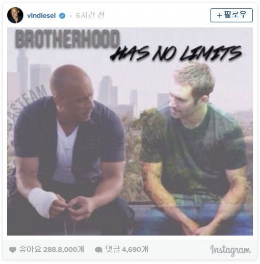 빈 디젤은 30일 자신의 페이스북을 통해 “네가 어디에 있든지 넌 나의 영원한 형제야(No matter where you are in this universe. You will always be, my brother)”라는 글과 사진을 올렸다.