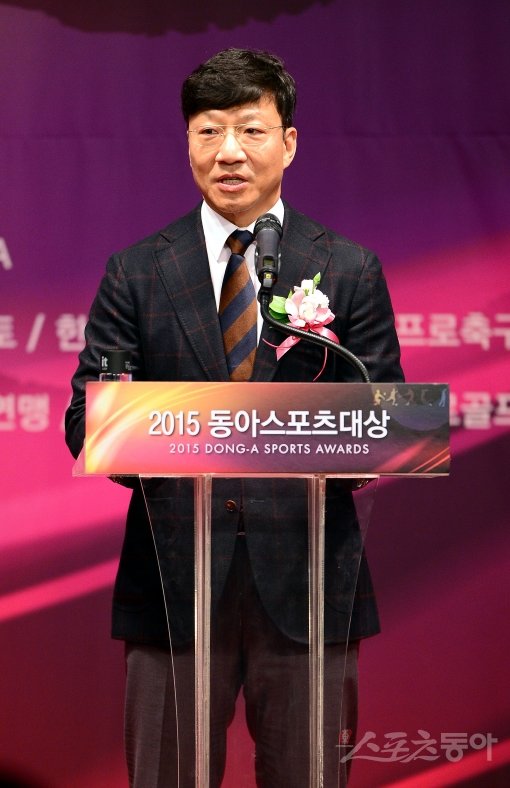 스포츠동아, 동아일보, 채널A가 공동으로 주최하고 국내 5대 프로스포츠(프로야구·프로축구·남녀프로농구·남녀프로배구·남녀프로골프) 종목별로 올 한해를 빛낸 최고의 선수를 선정하는 ‘2015 동아스포츠대상’ 시상식이 1일 오전 11시 서울 광화문 포시즌호텔에서 개최됐다. 동아일보 김재호 사장이 개회사를 하고 있다.