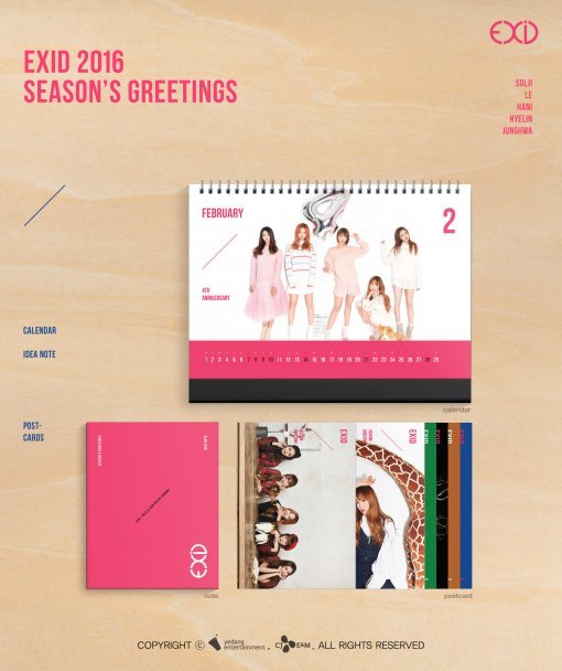 이에 대해 소속사 관계자는 “EXID의 2016 시즌 그리팅은 각각 탁상용 달력과 아이디어 노트, 엽서 세트로 구성되어 있고 특히 엽서 세트에는 팬들을 위한 멤버들의 미공개 사진도 포함돼 있어 더욱 특별한 선물이 될 것"이라며 "데뷔 이후 첫 발매되는 EXID의 시즌 그리팅이기 때문에 멤버들의 참여도가 높았고 곧 팬 사인회를 통해서도 팬들과 만날 계획이다”라고 전했다.