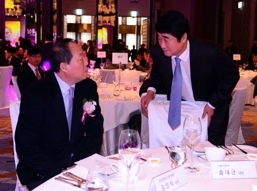 김인식 프리미어12 감독과 신치용 삼성화재 단장이 이야기를 나누고 있다.