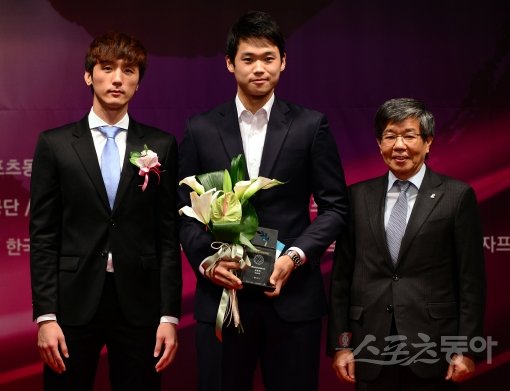 남자프로배구 올해의 선수상을 수상한 서재덕(한국전력)이 신원호 한국배구연맹(KOVO) 사무총장, 전년도 수상자 곽승석(대한항공)과 기념촬영을 하고 있다.