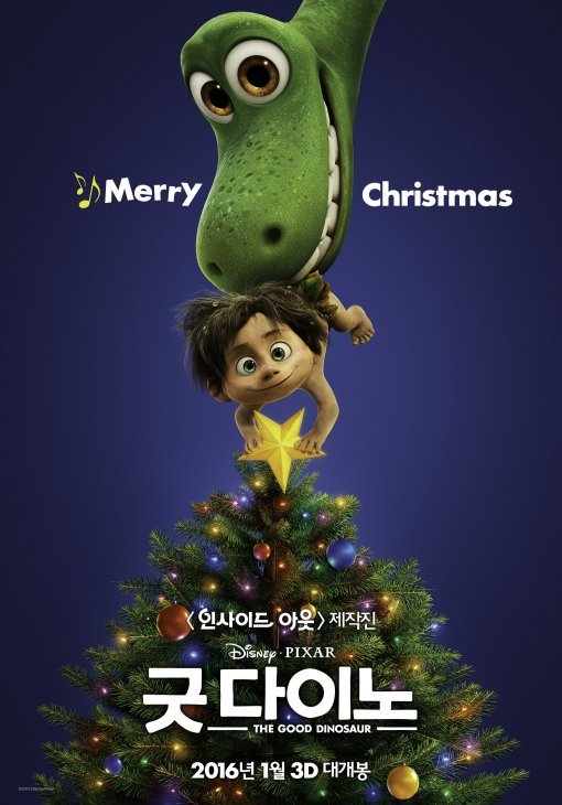 이번에 공개된 포스터는 크리스마스에 대한 설렘과 기대를 담고 있어 남녀노소의 마음을 단번에 사로잡는다. 먼저 진한 파랑색 배경에 솟아있는 크리스마스 트리 위로 불쑥 고개를 내민 '알로'와 '스팟'의 모습이 눈길을 끈다. 소심한 공룡 '알로'와 야생 소년 '스팟'은 장난기 가득한 표정으로 환상적인 케미를 선보여 보는 이들을 미소 짓게 한다. '스팟'의 손에는 크리스마스 트리의 대미를 장식할 황금 별이 들려 있고 알로의 얼굴 옆으로 “Merry Christmas”라는 카피가 자리함으로써 디즈니-픽사의 따뜻한 감성과 유쾌한 유머를 느낄 수 있다.
