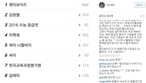 김창렬은 글과 함께 현재 포털 사이트 검색순위 사진을 올리며 “그나저나 활동당시에도 못해본 원더보이즈 1위 이렇게 해보네요. 원더보이즈가 더 잘됐다면 이런 일도 없을 텐데 아쉽네요”라고 글을 마무리 했다.