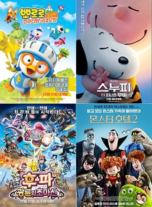 본격적인 겨울방학을 맞아 어린이 관객들을 노리는 다양한 애니메이션들이 개봉을 앞두고 있어 치열한 경쟁이 예상된다. ‘뽀로로 극장판 컴퓨터 왕국 대모험’을 비롯해 ‘스누피: 더 피너츠 무비’ 포켓몬 더 무비 XY ‘후파: 광륜의 초마신’ 그리고 ‘몬스터 호텔2’가 바로 그 주인공들.
