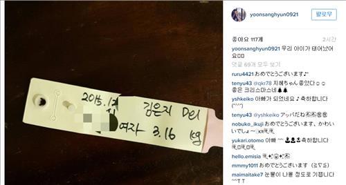 사진에는 산모 본명(김은지)과 아기 성별(여자), 몸무게(3.16kg) 등을 기록한 팔찌 모습이 보인다. 팬들과 지인들은 윤상현에게 축하 메시지를 보냈다.