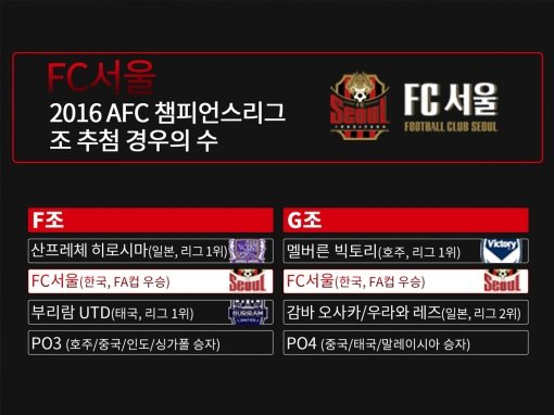 FC서울이 G조에 합류하게 된다면 호주 A리그 챔피언 멜버른 빅토리와 일본 J리그 2위, 그리고 PO4(중국/태국/말레이시아) 승자와 맞붙게 된다.