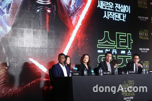 배우 존 보예가(왼쪽부터), 데이지 리들리, 아담 드라이버, J.J. 에이브럼스 감독이 9일 오전 서울 영등포구 콘래드호텔에서 열린 영화 '스타워즈:깨어난 포스'의 기자회견에 참석해 질의응답을 하고 있다.