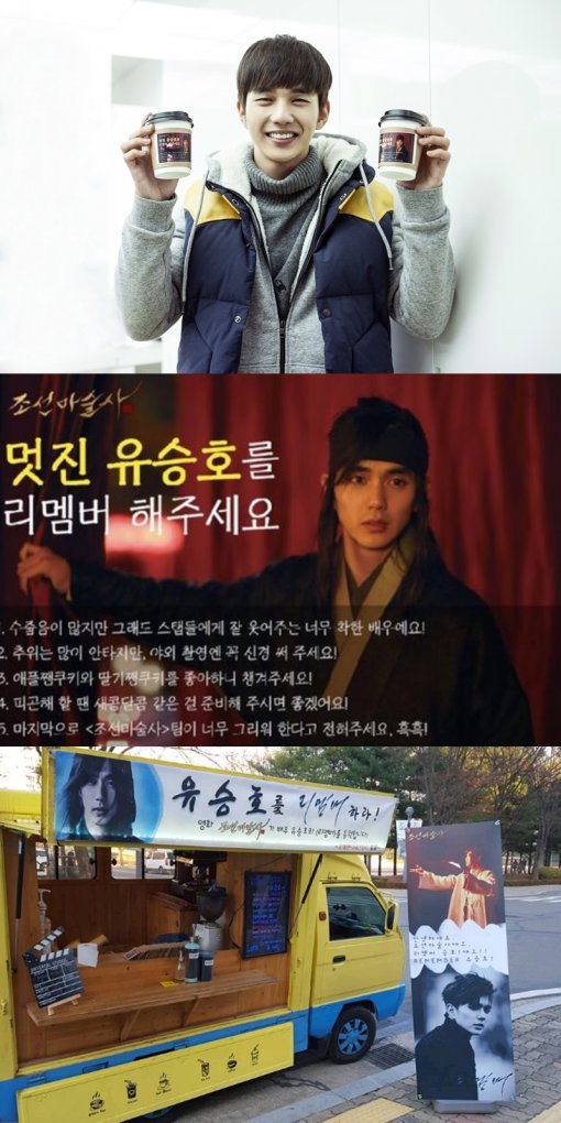 또 이 커피차의 컵홀더에는 ‘조선마술사’의 스태프가 직접 작성한 센스 넘치는 멘트도 더욱 돋보인다. ‘멋진 유승호를 리멤버해주세요’라는 제목 하에 유승호에 대한 설명이 이어지며 ‘수줍음이 많지만 그래도 스태프들에게 잘 웃어주는 너무 착한 배우예요’, ‘추위는 많이 안타지만 야외촬영엔 꼭 신경써주세요’는 멘트가 시선을 끈다.