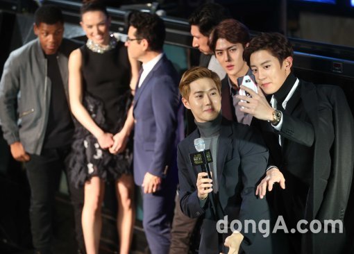 옆에 있던 찬열은 “J.J. 에이브럼스 감독뿐 아니라 배우들을 만나게 되어 영광”이라며 “찾아보니 존 보예가, 데이지 리들리와 동갑이더라. 만나서 반갑다”고 말했다. 그는 동갑내기 데이지 리들리와 어색한 인사를 주고받아 웃음을 자아냈다.