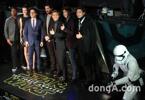 9일 오후 서울 강남구 힐탑호텔에서 열린 영화 스타워즈:깨어난 포스’ 팬 이벤트에서 스타워즈 출연배우들과 엑소의 수호, 세훈, 찬열이 포토타임을 하고 있다.