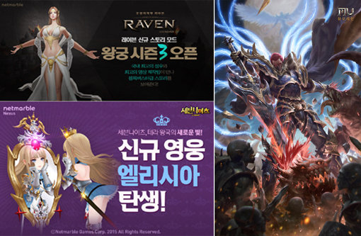 먼저 13일 구글플레이 기준 매출 10위권 내에 5개의 타이틀을 올려놓은 모바일게임 강자 넷마블게임즈가 지난달 말부터 각 게임에 대규모 업데이트를 단행하고 있다. 역할수행게임(RPG) ‘세븐나이츠’는 엘리시아와 노호 등 신규 영웅(캐릭터)을 추가했다. 게임 속 새로운 세력을 상징하는 엘리시아는 모든 포지션에 잘 어울리는 만능형으로, 검술 기반 물리공격 스킬을 사용한다. 넷마블게임즈는 엘리시아를 기점으로 신규 세력을 구성할 영웅들을 지속적으로 선보일 예정이다. 역사를 기록하는 사관 콘셉트의 신규 마법형 영웅 노호는 적군 2명의 생명력을 크게 감소시키는 스킬로 주목 받고 있다.