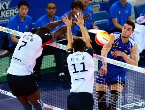대한항공 새 외국인공격수 모로즈(오른쪽)가 13일 천안 유관순체육관에서 열린 현대캐피탈과의 원정경기 도중 상대 블로킹을 피해 스파이크를 날리고 있다. 천안|김종원 기자 won@donga.com