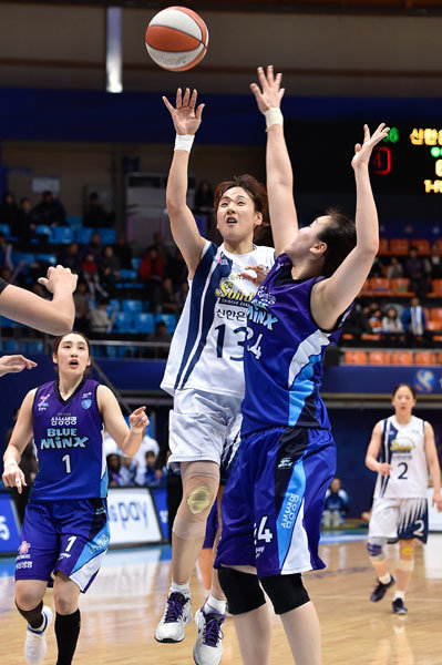 신한은행 김단비(가운데)가 13일 인천도원체육관에서 열린 ‘KDB생명 2015~2016 여자프로농구’ 홈경기에서 삼성생명 배혜윤(오른쪽)의 수비 위로 플로터를 시도하고 있다. 사진제공|WKBL