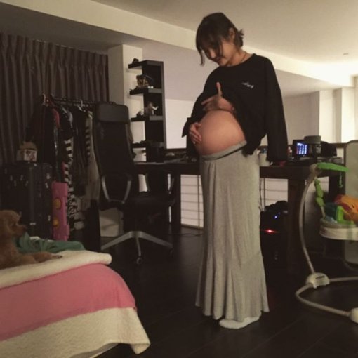 유리는 15일 자신의 SNS에 “만삭도 아닌데 어쩜 이리 많이 나오지? 아직도 3개월 남았는데…둘째야 천천히 크렴~ ” 이라는 글고 함께 사진 한장을 게재했다.