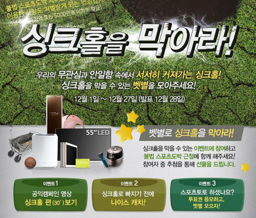 시작한지 2주 만에 약 4만회의 조회수를 기록 중인 이번 이벤트는 체육진흥투표권 스포츠토토의 수탁사업자인 케이토토(www.ktoto.co.kr)가 선보인 공익 캠페인 ‘싱크홀’ 편을 소개하는 한편 불법 스포츠 도박의 위험성을 알리고 경각심을 고취시키기 위해 마련됐다. 이벤트에 참여하려면, 새로운 공익 캠페인 영상을 시청하거나 싱크홀을 막는 게임에 참여하면 된다. 구입한 투표권을 등록한 사람에게는 추첨을 통해 삼성전자 55인치 TV, LG 스타일러, 아이패드 에어2, 쿠쿠 밥솥 등 푸짐한 상품을 증정하며, 매일 주어지는 스페셜 벳별을 획득한 회원 총 560명에게는 파리바게뜨, 배스킨라빈스 등에서 사용할 수 있는 해피콘 5000원권을 나눠준다. 이번 공익 캠페인은 불법 스포츠 도박에 대한 사람들의 무관심과 불감증이 거대한 싱크홀을 만들어 결국 건강한 스포츠 환경과 관람문화, 그리고 건전한 레저생활에 이르기까지 모든 것을 앗아갈 수 있다는 내용을 담고 있다.